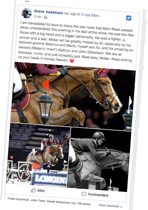 Shane Sweetnam´s Main Road (SWB born 2008 by Heartbeat out of Main Mirco (1) 25232 by Irco Marco-Crown Point xx, breeder Marina Björkman Team AMY HB) has unexpectedly passed away in his stall at a competiton show in Wellington. Sweetnam writes; "He was the little horse with a big heart and a bigger personality. He was a fighter, a winner and a star".